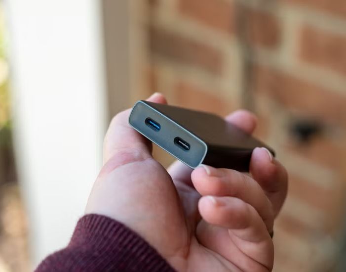 65W Power Adapter with Dual USB-C Ports and Flip-Out Prongs - Side View