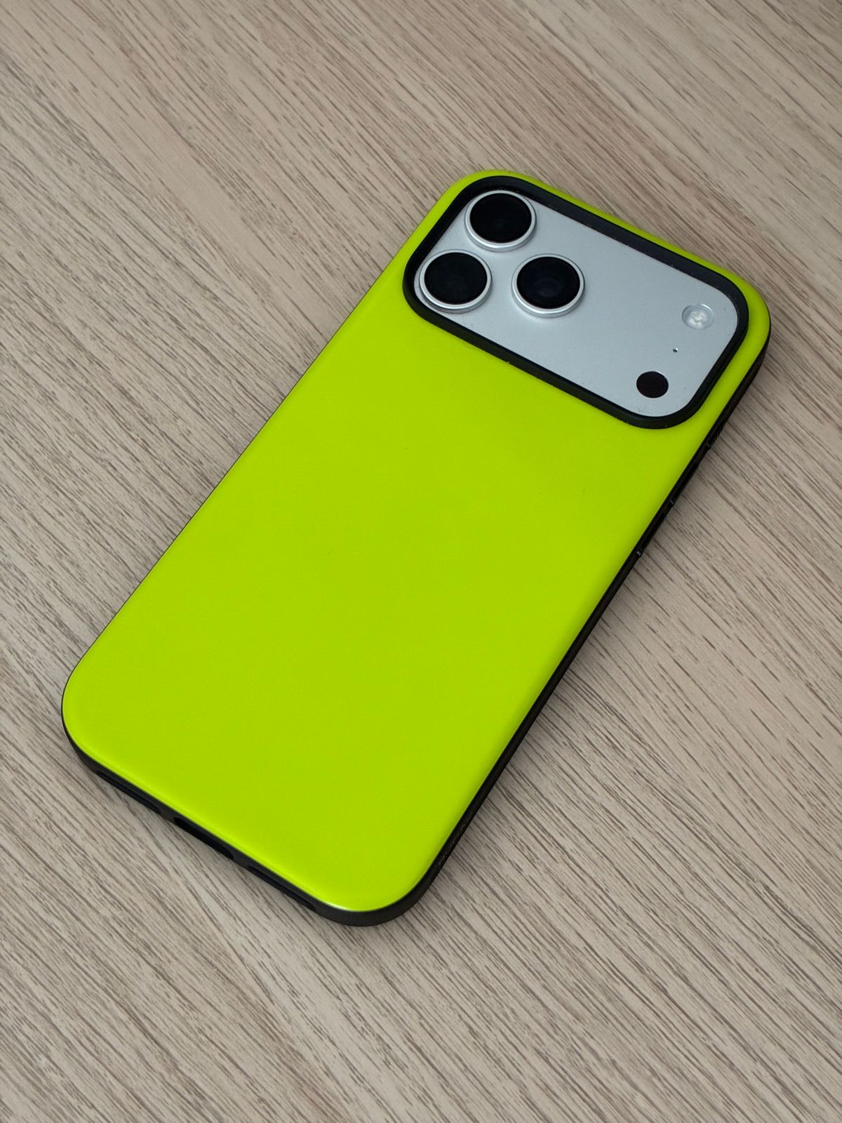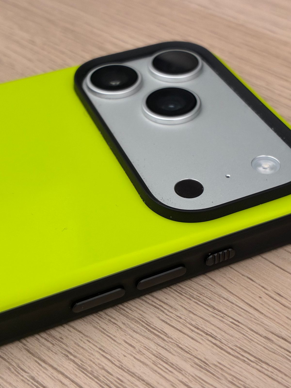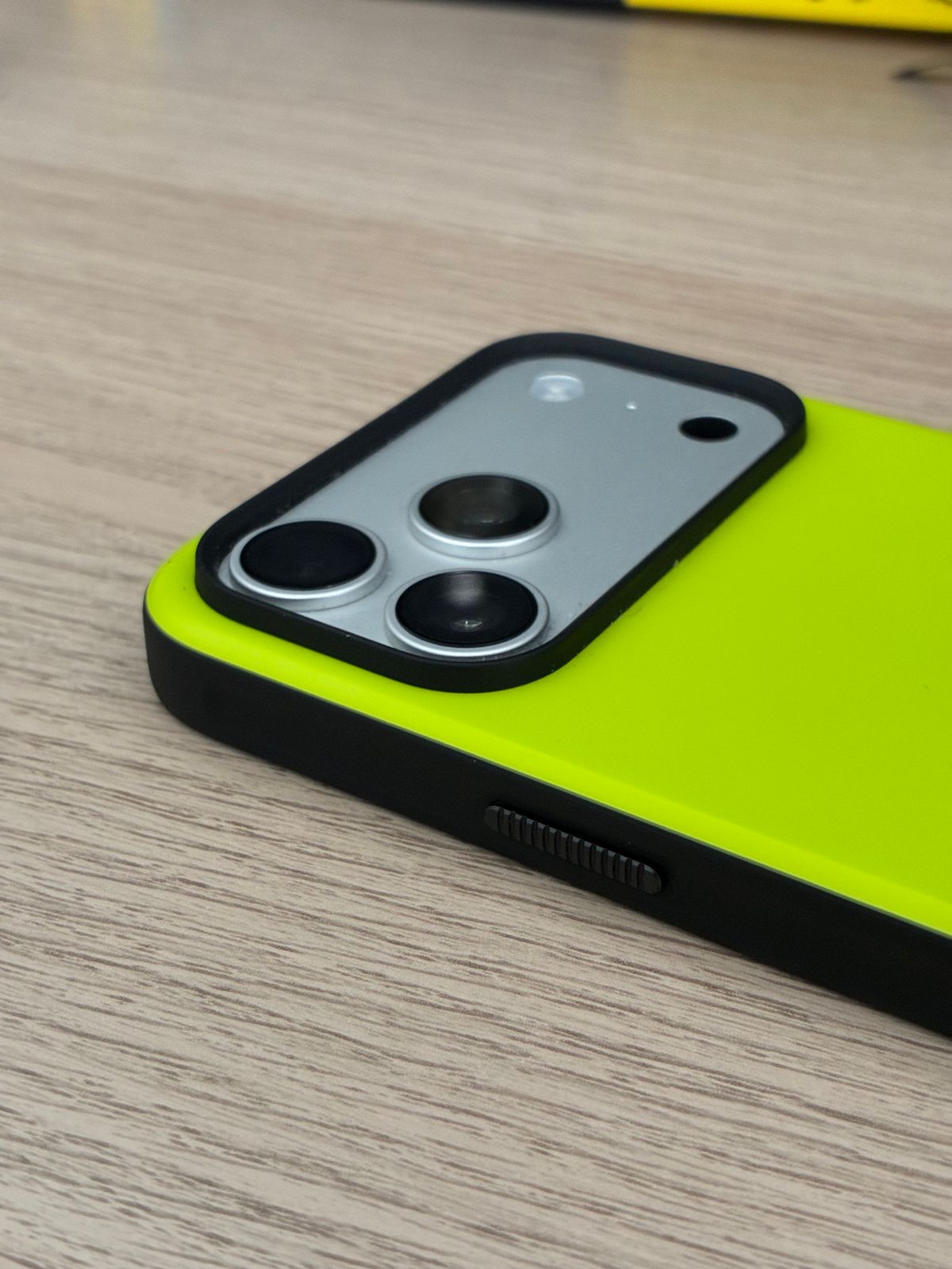 The Nomad Modern Case - iPhone 17 Pro | Volt features a bright yellow finish, TPU bumper, and showcases three rear cameras with a flash in the top left silver rectangular module.