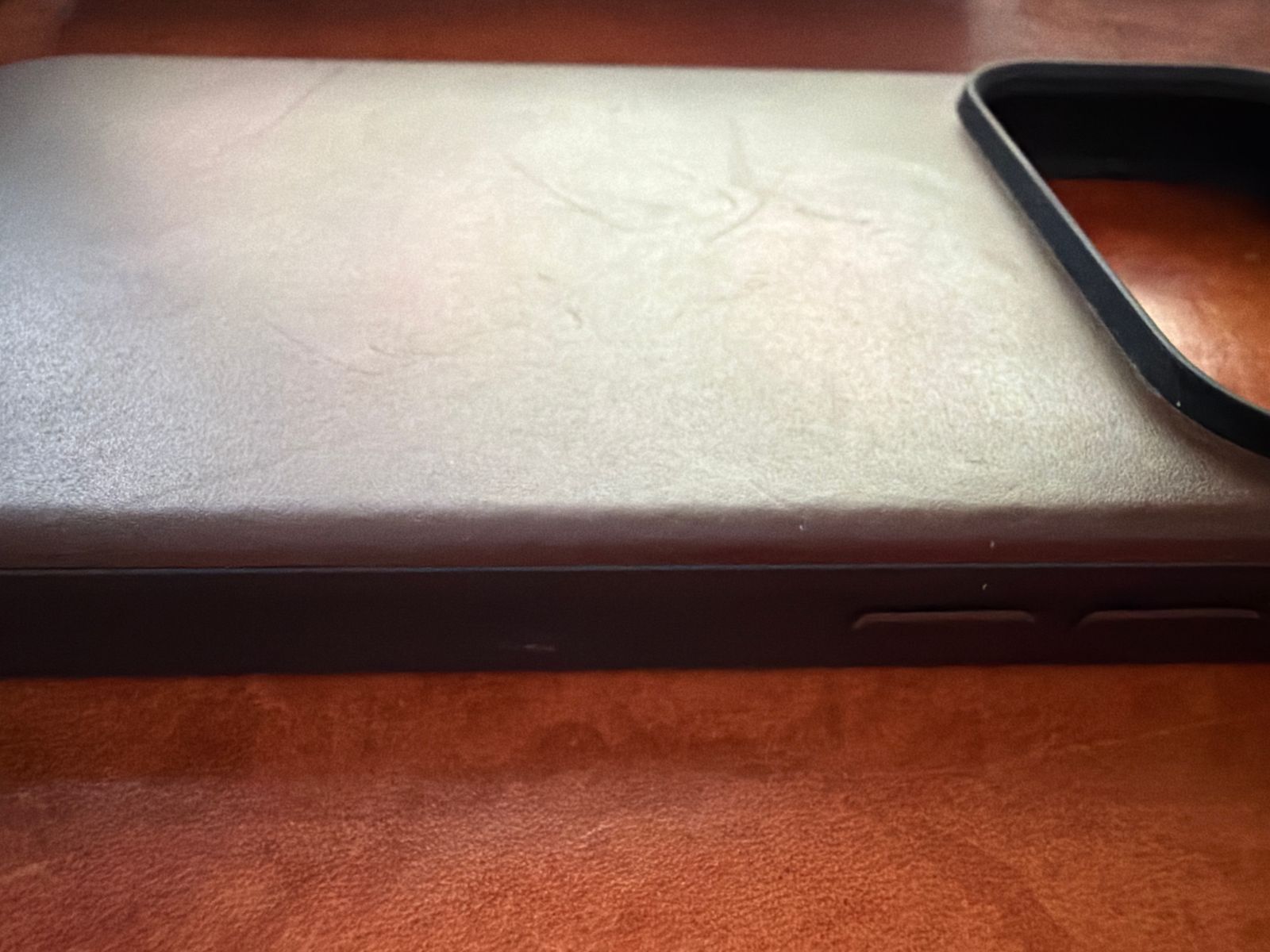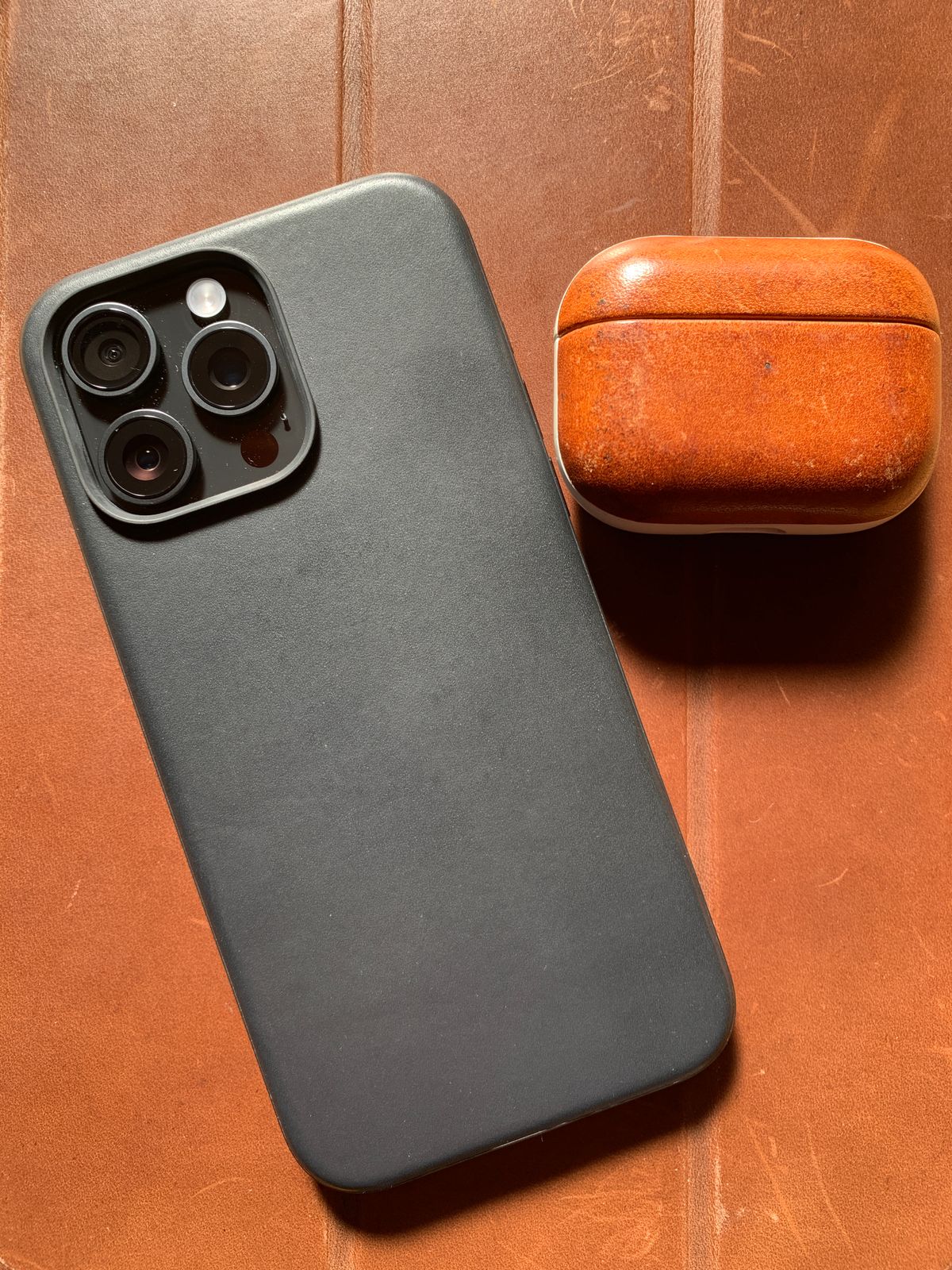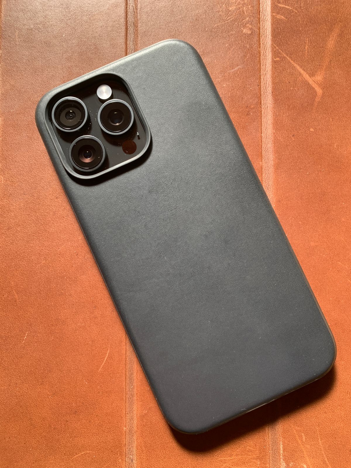 I just bought this iPhone 15 Pro Max and Nomad leather case brand new, and the brown one was sold out, so I chose the black one, which may be why it doesn't age as well. The Nomad leather case is great, but if I had to say one thing, it's that I use a MagSafe charger in my car mount, and the magnetic force isn't strong enough to keep it moving, which is a bit of a problem.