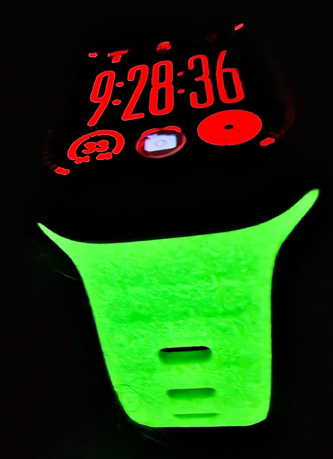 Comfortable and quirky watch band that keeps you seen, even in total darkness. The glow-in-the-dark green band feels good and doesn’t cause your wrist to sweat. A very nice sport band indeed.